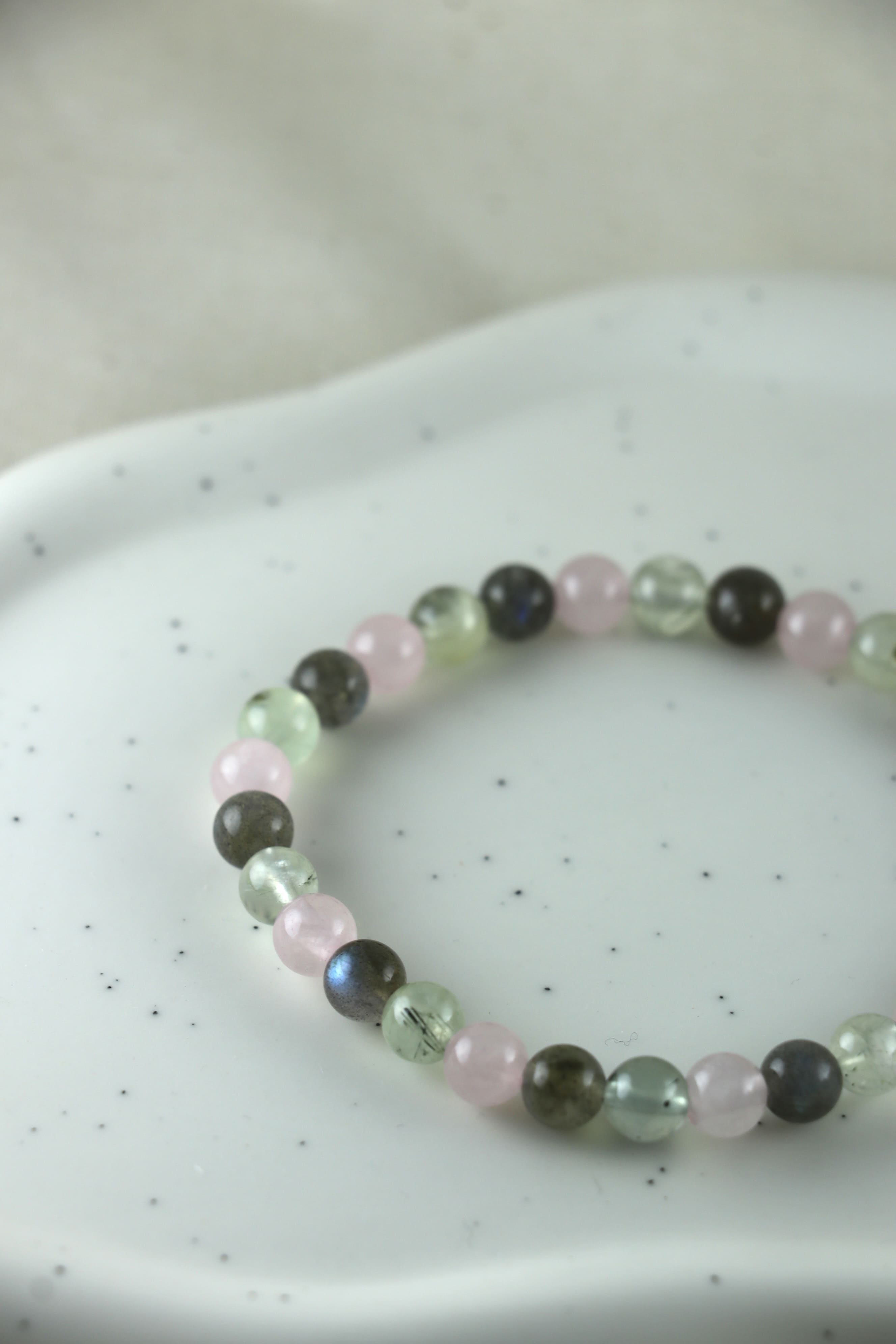 Steine: Rosenquarz, Prehnit, Labradorit