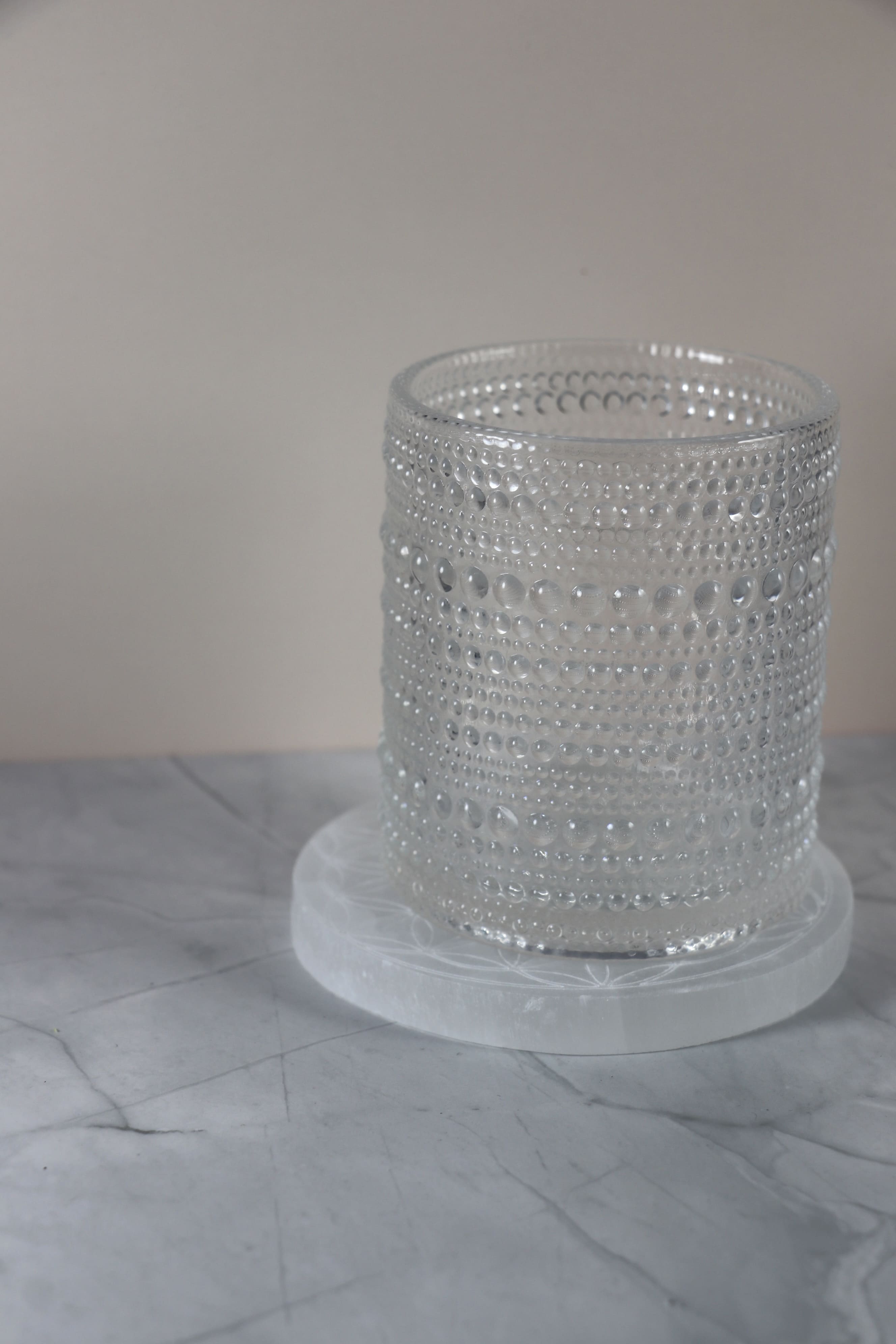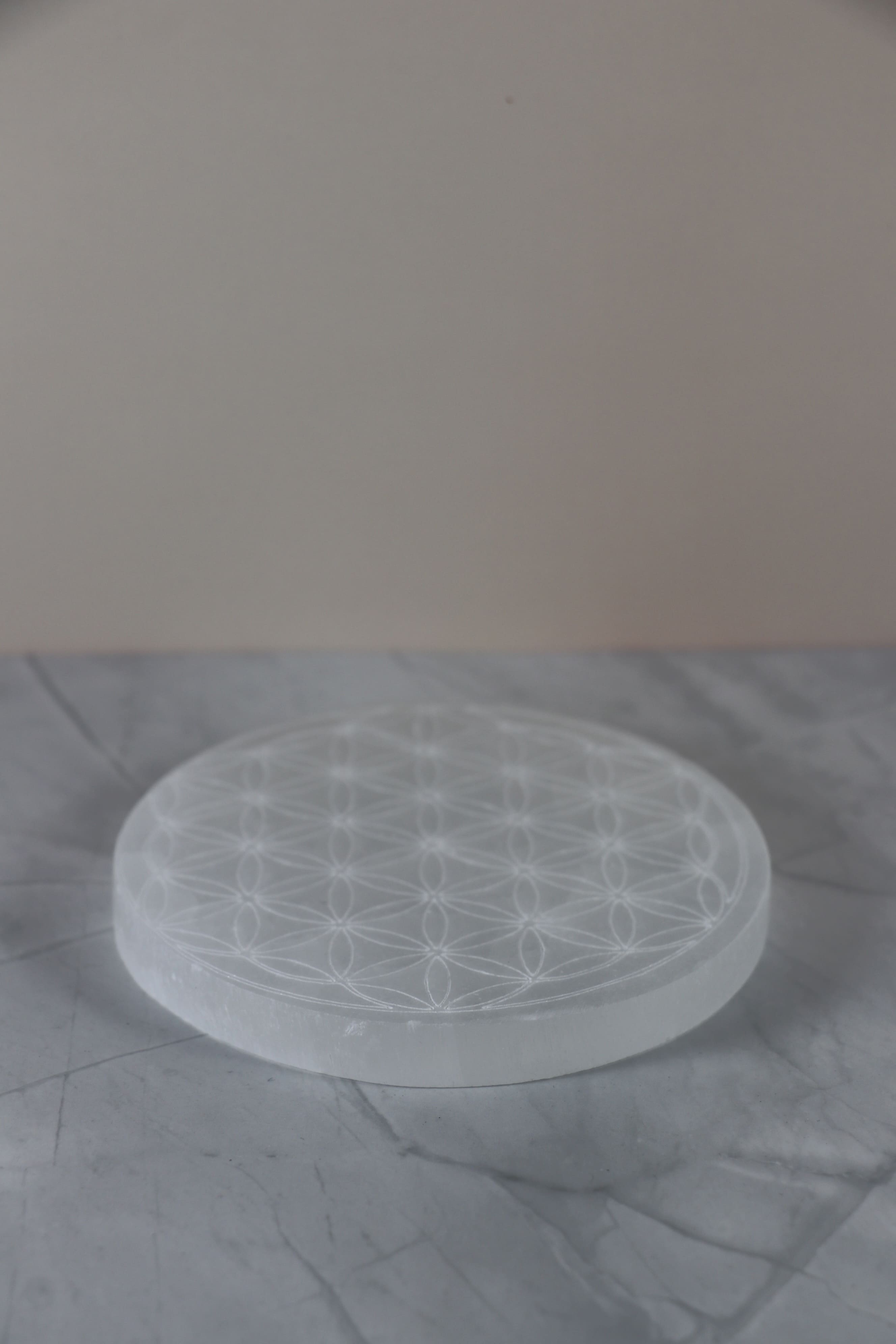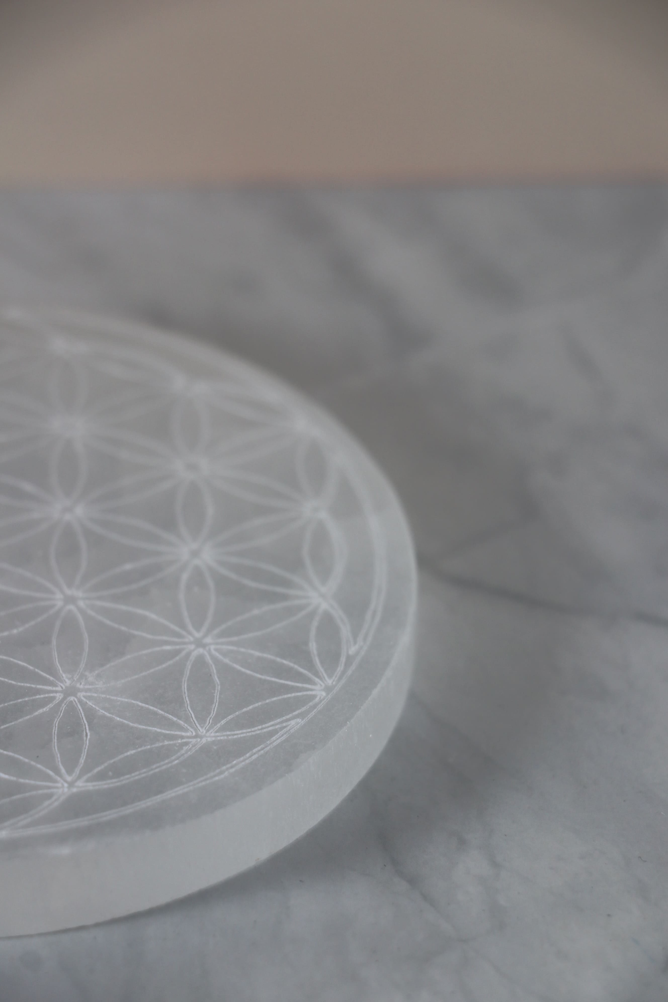 Dieser Untersetzer mit der Blume des Lebens vereint eines der kraftvollsten Symbole mit der Reinheit und Harmonie des Selenits.